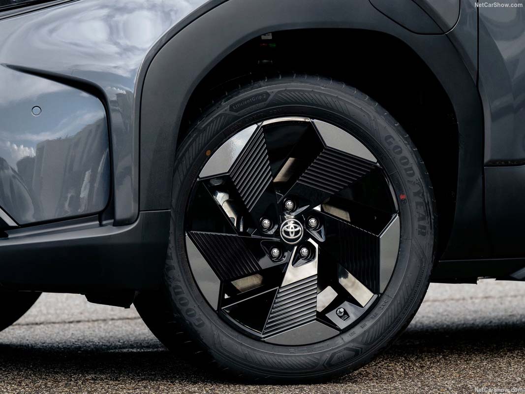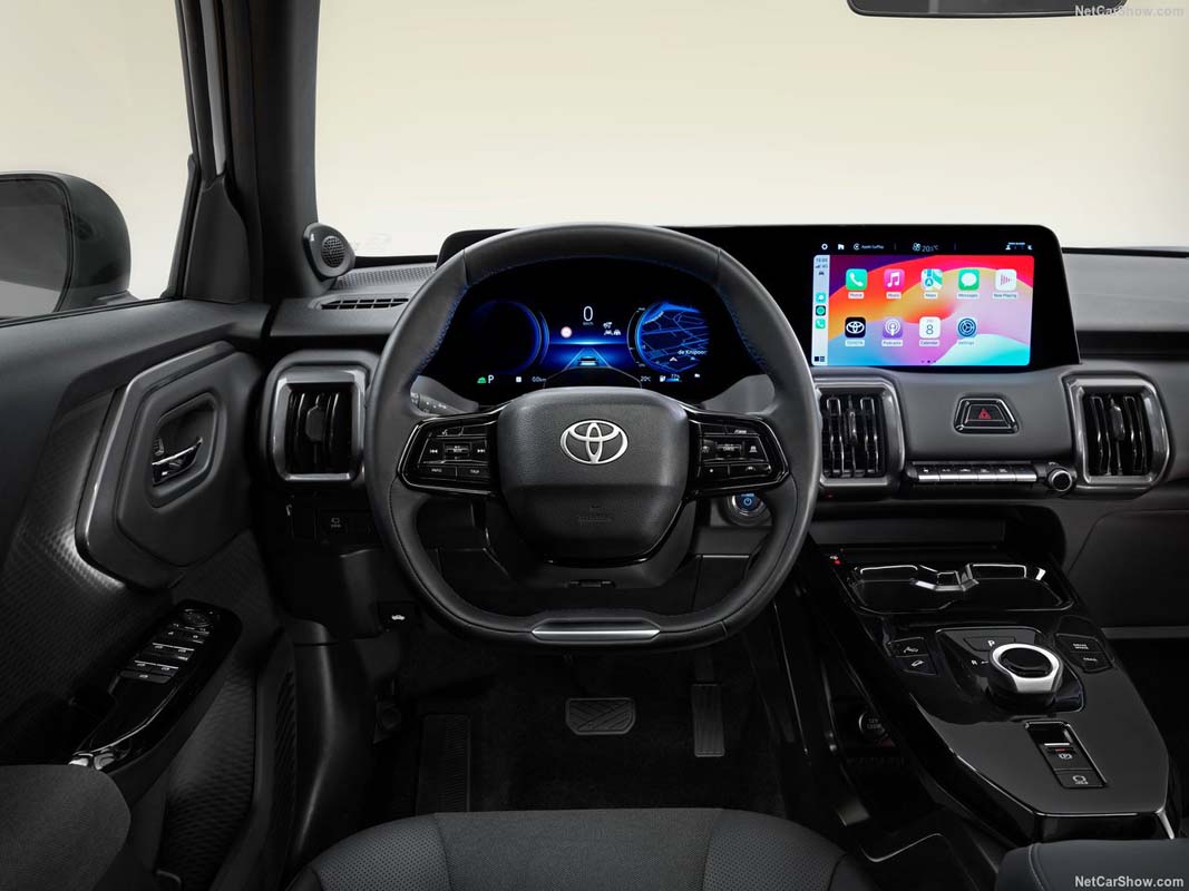 简单来说,它比 Toyota Yaris Cross 更大一点,但又比 bZ4X 更小,刚好卡在一个“城市刚刚好、空间又不小”的区间。设计方面则采用 Toyota 最新的“hammerhead”设计语言,整体线条偏硬朗,搭配黑化轮拱与双色车身,看起来比传统 Toyota SUV 更年轻、也更有电动车味道。